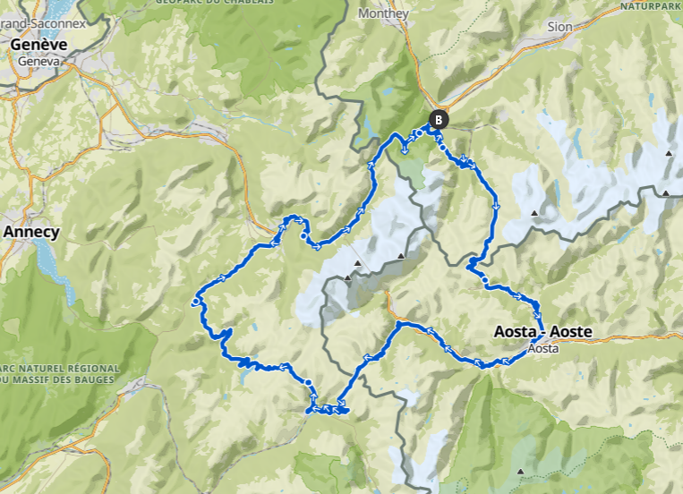 Wir starten den Event und nehmen gleich zu Beginn den Col Champex (1495 m) in Angriff. Nach einer kurzen Abfahrt folgt der Anstieg zum Col du Grand-Saint-Bernard (2473 m). Oben auf der Passhöhe verabschieden wir uns von der Schweiz und rollen auf italienischem Boden. Die anschliessende 40 Kilometer lange Abfahrt führt uns ins Aostatal, wo wir in Arvier unser Hotel beziehen.